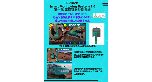 港進建機服務中心有限公司專門研發有關建造機械安全、提昇效能及節省能源產品的服務機構。我們關注地盤的移動式機械意外頻生,因此,公司決定研發鷹網智能監測系統,來解決操作機械上的盲點,操作員從高清監視器在零盲點下,能清晰觀察四周環境有否障礙物,從而大大提升地盤作業安全。